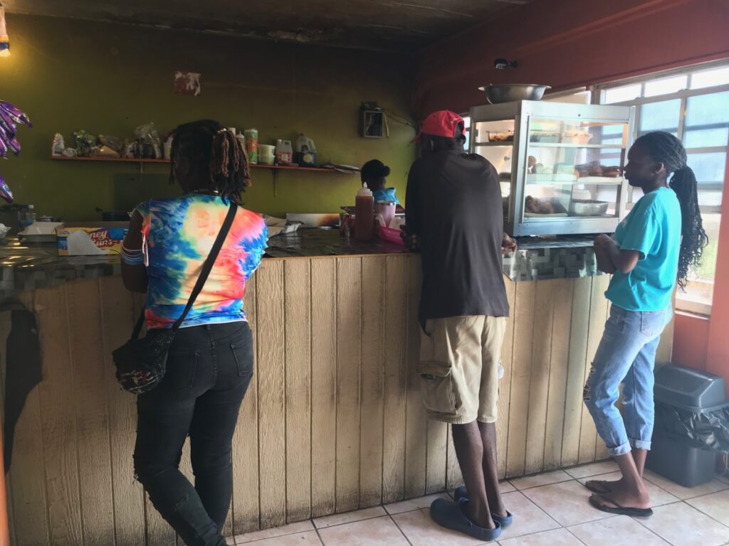 In the village you can buy food and take it to a bar, and you can buy beer and take it to a food outlet – no one objects and some places do both. There may also be a before-church fund-raising breakfast or a fish fry at the weekend. There are often people barbecuing such as Wanda’s Grill and you will see young fishers cooking their lobster on open fires straight from the sea. Look for boats at the Fisheries wharf, as they come in at different times – often around 2 – 4pm on good weather days. There is no butcher so all fresh, local meat is still sold on the street from a table after slaughtering or just by word of mouth and other imported meat is sold frozen in the shops. Local specialities include deer meat, land turtle; seafood – like lobster, crab, conch; locally raised beef, lamb or goat, with side dishes of rice, fungi, ground provisions, or dumplings – especially yabba dumplings. Some foods are only available at certain times and so are harder to find – or you can ask a local cook to prepare something for you.